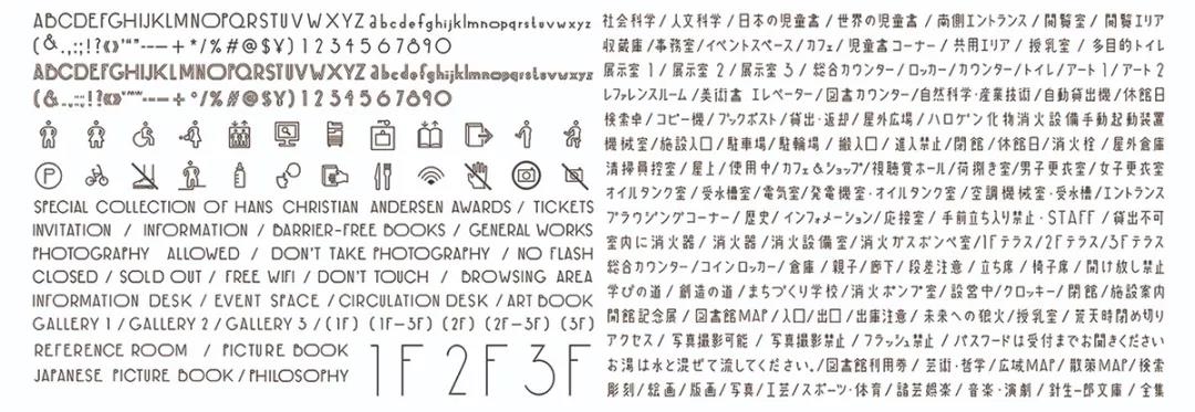 基于建筑独特的设计,Hirano Atsushi 设计了一套易于辨识的导视系统,将建筑外观特点体现在logo中,使用手写风格的字体和象形图。儿童区使用荧光灯管标牌,艺术书角使用艺术字体标牌,视听大厅使用色彩丰富的标牌,图书馆内则使用曲线镜面作为标牌,所有标牌与建筑相协调,设计简单却令人印象深刻,为太田市美术馆·图书馆注入新活力。